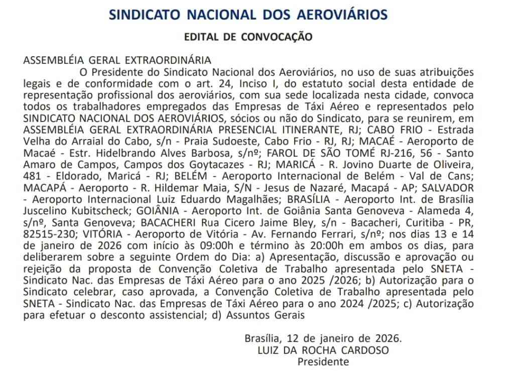 O Presidente do Sindicato Nacional dos Aeroviários, no uso de suas atribuições legais e de conformidade com o art. 24, Inciso I, do estatuto social desta entidade derepresentação profissional dos aeroviários, com sua sede localizada nesta cidade, convoca todos os trabalhadores empregados das Empresas de Táxi Aéreo e representados pelo SINDICATO NACIONAL DOS AEROVIÁRIOS, sócios ou não do Sindicato, para se reunirem, em ASSEMBLÉIA GERAL EXTRAORDINÁRIA PRESENCIAL ITINERANTE, RJ; CABO FRIO – Estrada Velha do Arraial do Cabo, s/n – Praia Sudoeste, Cabo Frio – RJ, RJ; MACAÉ – Aeroporto de Macaé – Estr. Hidelbrando Alves Barbosa, s/nº; FAROL DE SÃO TOMÉ RJ-216, 56 – Santo Amaro de Campos, Campos dos Goytacazes – RJ; MARICÁ – R. Jovino Duarte de Oliveira, 481 – Eldorado, Maricá – RJ; BELÉM – Aeroporto Internacional de Belém – Val de Cans; MACAPÁ – Aeroporto – R. Hildemar Maia, S/N – Jesus de Nazaré, Macapá – AP; SALVADOR – Aeroporto Internacional Luiz Eduardo Magalhães; BRASÍLIA – Aeroporto Int. de Brasília Juscelino Kubitscheck; GOIÂNIA – Aeroporto Int. de Goiânia Santa Genoveva – Alameda 4, s/nº, Santa Genoveva; BACACHERI Rua Cicero Jaime Bley, s/n – Bacacheri, Curitiba – PR, 82515-230; VITÓRIA – Aeroporto de Vitória – Av. Fernando Ferrari, s/nº; nos dias 13 e 14de janeiro de 2026 com início às 09:00h e término às 20:00h em ambos os dias, paradeliberarem sobre a seguinte Ordem do Dia: a) Apresentação, discussão e aprovação ourejeição da proposta de Convenção Coletiva de Trabalho apresentada pelo SNETA – Sindicato Nac. das Empresas de Táxi Aéreo para o ano 2025 /2026; b) Autorização para oSindicato celebrar, caso aprovada, a Convenção Coletiva de Trabalho apresentada pelo SNETA – Sindicato Nac. das Empresas de Táxi Aéreo para o ano 2024 /2025; c) Autorização para efetuar o desconto assistencial; d) Assuntos Gerais.